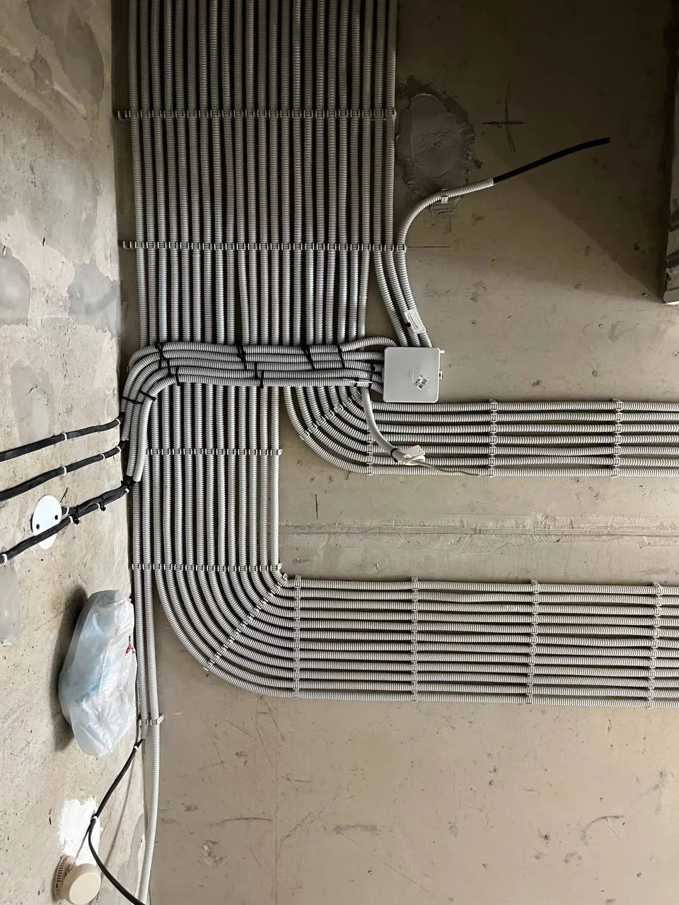 Этап начинается с разметки трасс, по которым проходит электрический кабель, делаются лунки под розетки и выключатели. Прокладка кабеля осуществляется по полу или потолку, в искусственных конструкциях из гипсокартона.